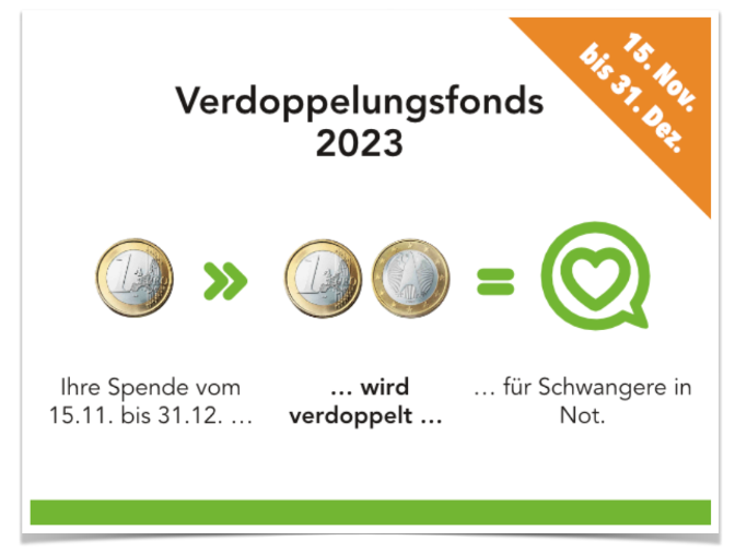 Genau das macht die bisherige überwältigende Beteiligung am diesjährigen Verdoppelungsfonds überdeutlich: Unsere Unterstützer haben seit dem Beginn der Verdoppelungsaktion bis heute 295.714 Euro für Schwangere in Not gespendet. Das bedeutet, dass schon jetzt insgesamt 591.428 Euro zusätzlich in die Informationen, die Beratung und die Hilfe fließen werden, die jeden Tag hunderte Entscheidungen für das Leben ermöglichen!