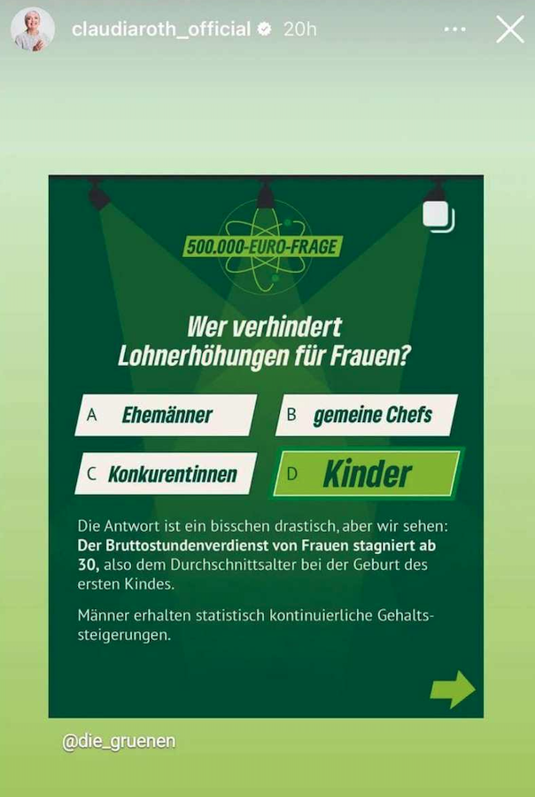 BERLIN. Ein offenbar lustig gemeintes Quiz auf Instagram offenbart die Kinderfeindlichkeit der Grünen. Am sogenannten „Equal Pay Day“ (6. März), der auf Lohnungerechtigkeiten zwischen Männern und Frauen aufmerksam machen soll, veröffentlichten die Grünen eine Wissensabfrage rund um die Jobsituation von Frauen. Das berichtet das Portal "NiUS".